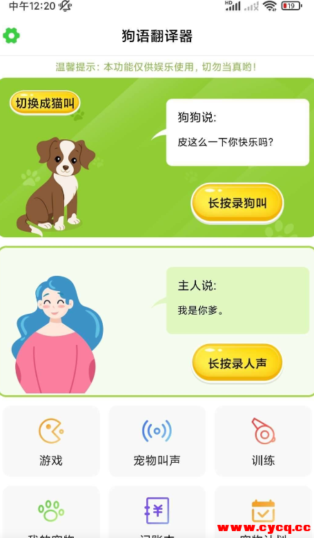 我们内置了许多不同种类的猫叫声和狗叫声,用户可以点击播放各种不同的声音。
