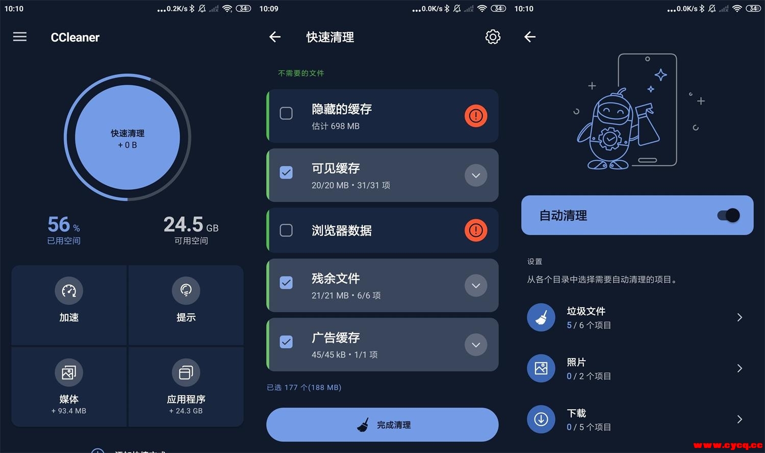 软件介绍 CCleaner是一款手机垃圾文件扫描清理工具,可以对手机中的第三方应用程序、网络缓存、浏览历史、通话记录、短信等内容进行清理。相信大家对电脑版的都不陌生,安卓版本同样给力,已解锁专业版! 软件截图